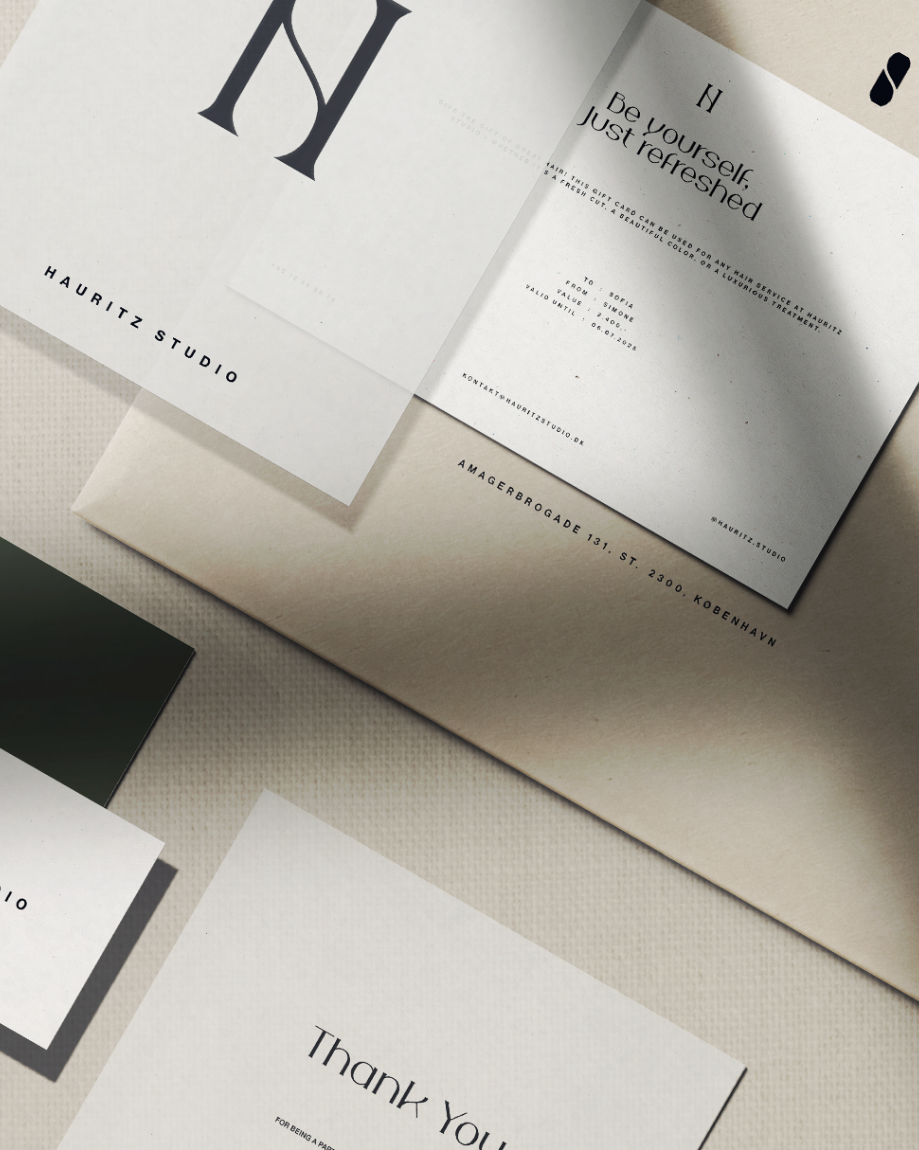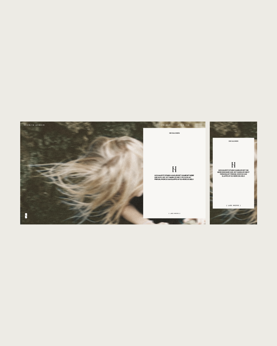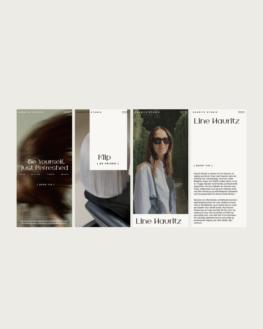 Hauritz Studio is a hair salon with a calm and considered brand expression. The project focuses on creating a complete visual identity alongside designing and developing an interactive website that reflects the atmosphere of the salon and supports a clear digital presence. The visual identity is built around a refined logotype, a soft and natural color palette, and a typographic system chosen to support clarity and a calm tone. These elements are applied consistently across print, signage, and digital touchpoints, creating a cohesive and recognisable expression. The website extends the identity through restrained layouts, subtle transitions, and considered interactions. Logo animations and supporting motion elements add movement while maintaining a balanced and understated experience.